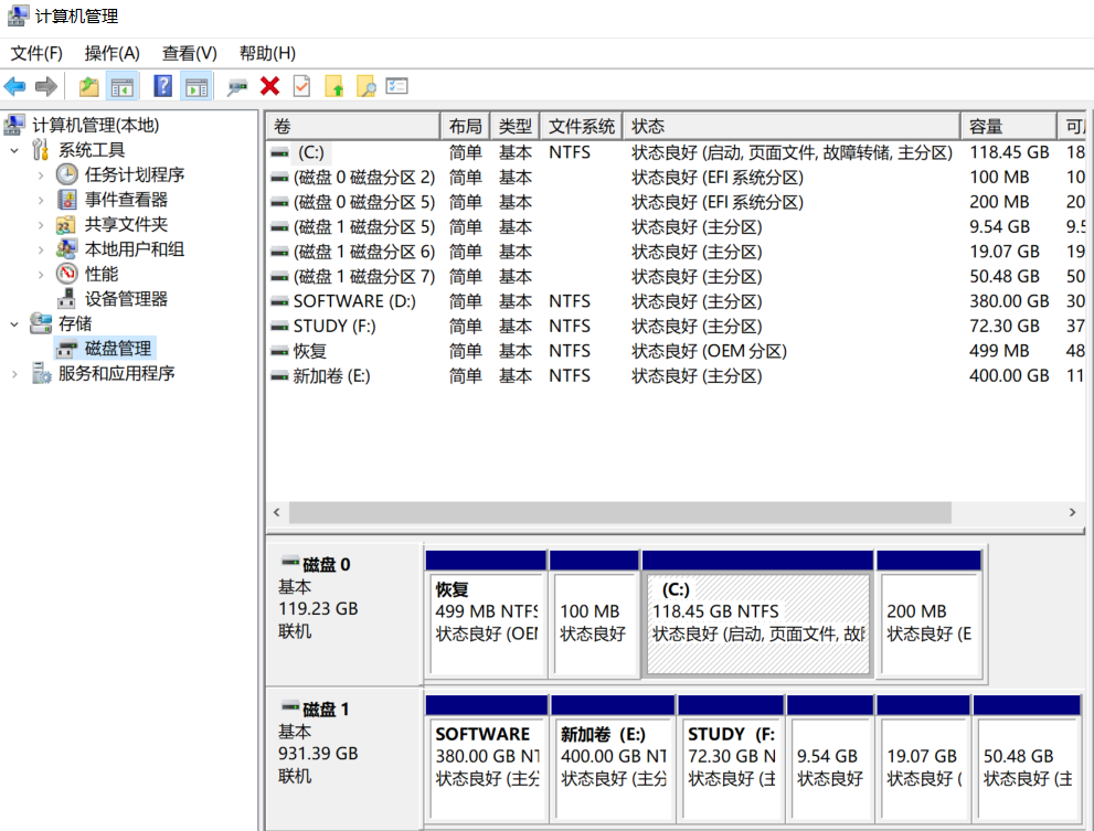 1. 使用 Windows 10, 右键单击“ 这台计算机”, 选择“ 管理 ”, 然后是“ 磁盘管理 ”, 显示磁盘管理界面 。