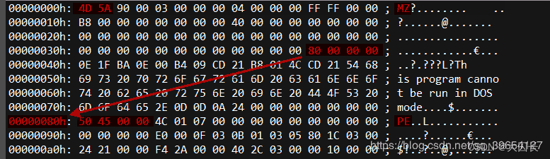 DOS MZ文件头实际上是一个结构(IMAGE_DOS_HEADER),占有64字节