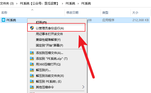 7.打开未压缩的文件夹,右击PE系统并选择运行为管理员。
