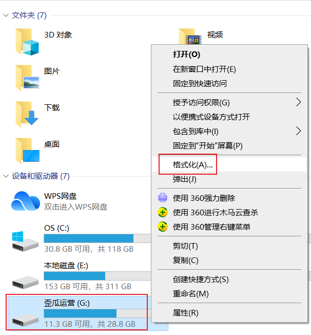 2.首先,打开我的电脑,然后按在选择中插入的U磁盘,右击并选择格式。