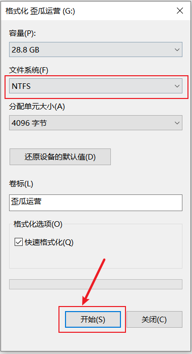 3.在面板上的【文件系统】处点击选择【NTFS】,然后再点击【开始】。(文件系统处选择【NTFS】是为了U盘能够存储单个内存大于4G的文件,不然就会无法放入大于4G的单个文件的情况出现)。