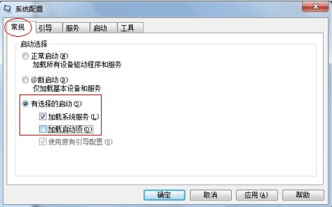 3.在常规选项卡上单击以选择有选择的启动选项,然后单击以清除选项加载启动项复选框。
