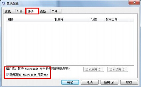 4.在“服务”选项卡上,单击以选中“隐藏所有 Microsoft 服务”复选框,然后单击“全部禁用”。