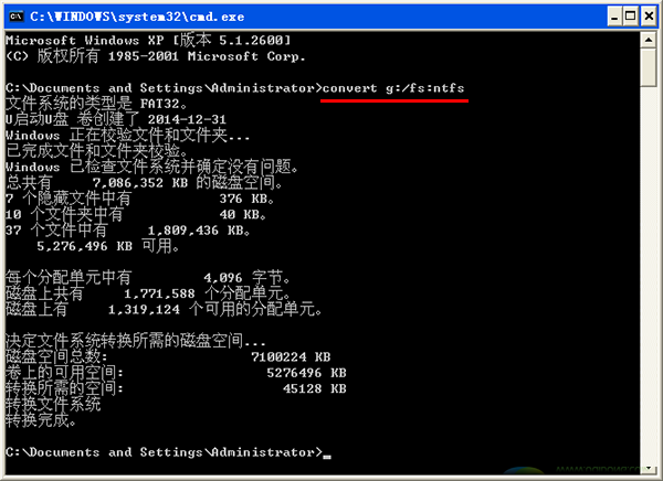 只要我们把U盘FAT32格式转换为NTFS格式就可以了,转换时很简单,只要一个命令就可以了。下面是具体操作方法: