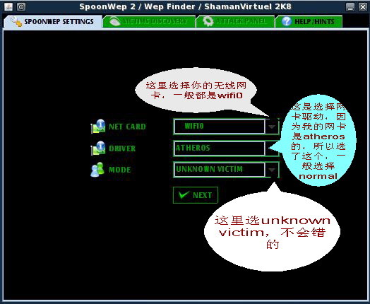 启动spoonwep2后会看到选择网卡信息设置窗口,需要我们依次设置本地网卡接口,无线网卡芯片类型