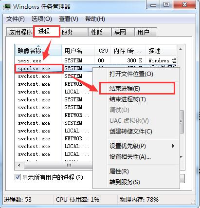 1、右键点击任务栏,选择启动任务管理器,在任务管理器中选择进程标签,右键点击Spoolsy,选择“结束进程”;
