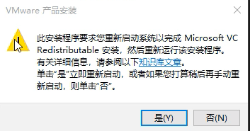 在安装 VMware 工作站之前, 您想要重新启动吗?