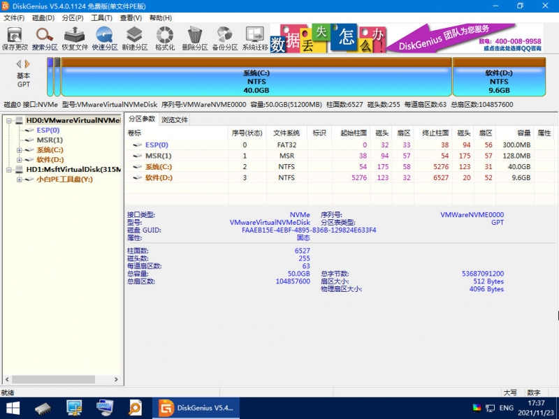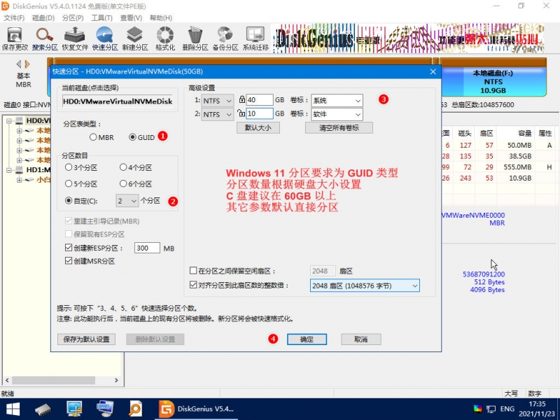 3. 打开PE系统桌面上的分区工具(DiskGenius),选择硬盘,并开始快速分割。视窗11的分区类型需要一个图形用户界面类型,分割区的数目可根据硬盘的大小确定,通常500GB可以分为四三个区块,而其他区块则可以自己确定。