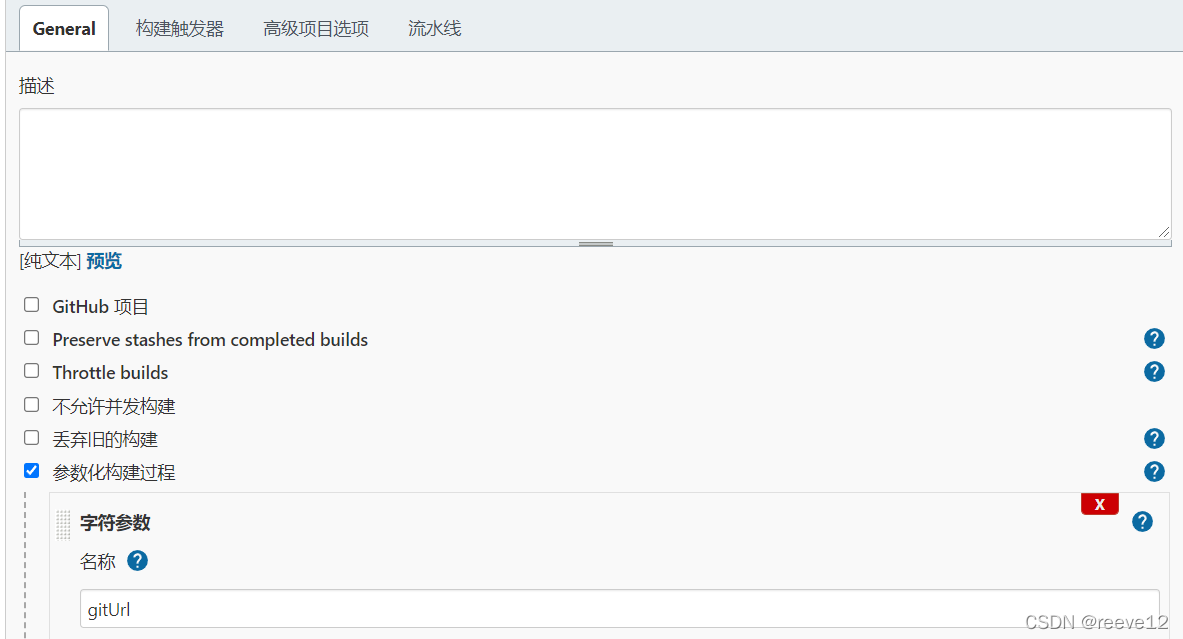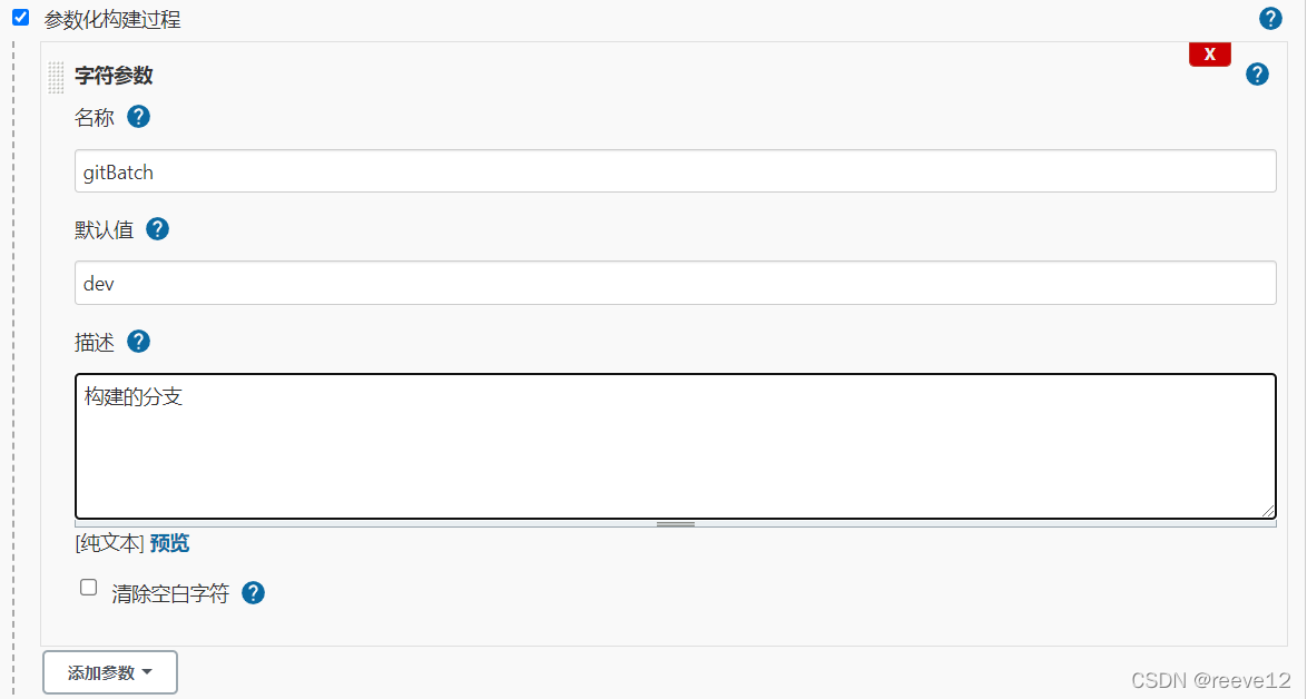 参数构建过程:动态配置参数,然后可以在项目建设之前填充,例如,适当的分支可以在项目建设之前填充,例如,这里我选择了名为 " gitBatch " 的 " 字符参数 ",称为 " gitBatch ",默认值 " dev ",然后我们经过整个过程,在不填充该参数的情况下展示施工是如何运作的。
