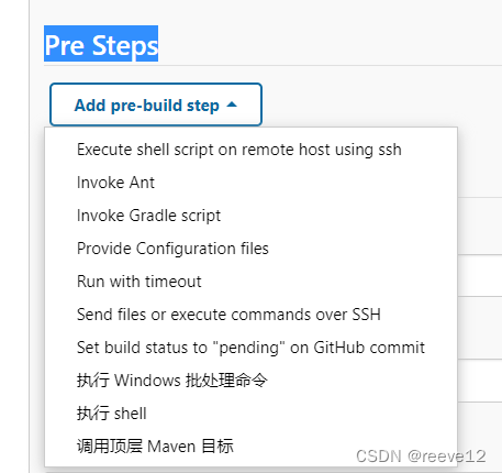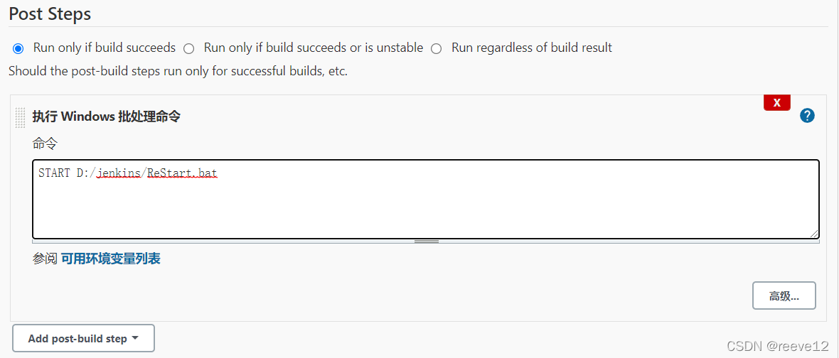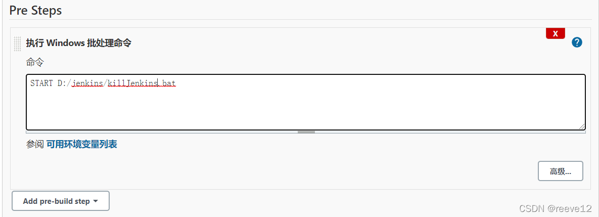 Pre Steps:在Build之前的操作,执行Windows批处理命令,命令:START D:/jenkins/killJenkins.bat。原因的话在Maven 工程中用于配置某些坑的两节点中进行详细说明;