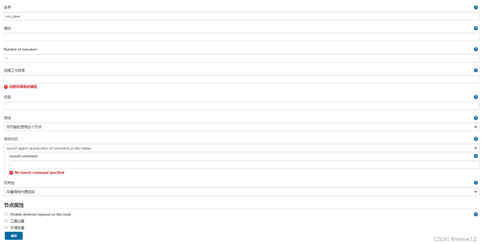 用法: 控制 Jenkins 如何组织此机器的构造。 两个选项 : 要尽量使用此节点, 只允许使用此机器的操作 。 前 Jenkins 将尽最大可能使用此节点 。 如果能够使用此节点来制造任务, Jenkins 将帮助他; 后一位 Jenkins 将只能构建指定在节点上的任务, 并且将毫无用处 。