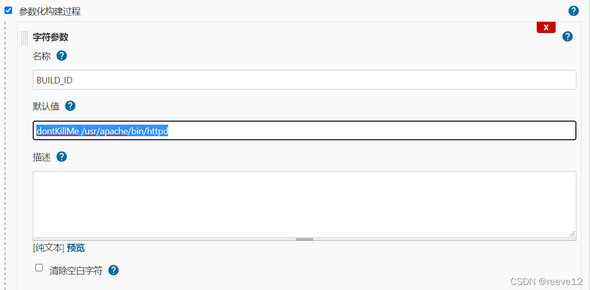 参数化构建过程:新增BUILD_ID,dontKillMe /usr/apache/bin/httpd。原因的话在Maven 工程中用于配置某些坑的两节点中进行详细说明;