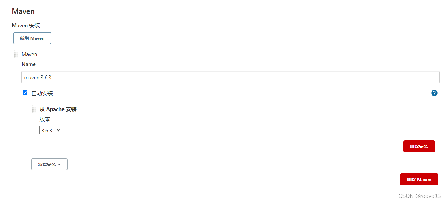 配置 maven : 如果您不想在 Jenkins 中下载 Maven, 您可以检查自动安装 。 如果您想要安装您下载的 Maven, 您必须首先通过 docker 将其传送到 Jenkins 服务器, 以便解构和设置 。 不需要直接安装它 。