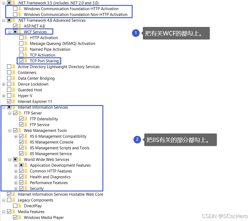 运行打开 Windows 功能窗口的输入“可选特性”并检查是否装入 WCF 和 IIS,如下文所示。