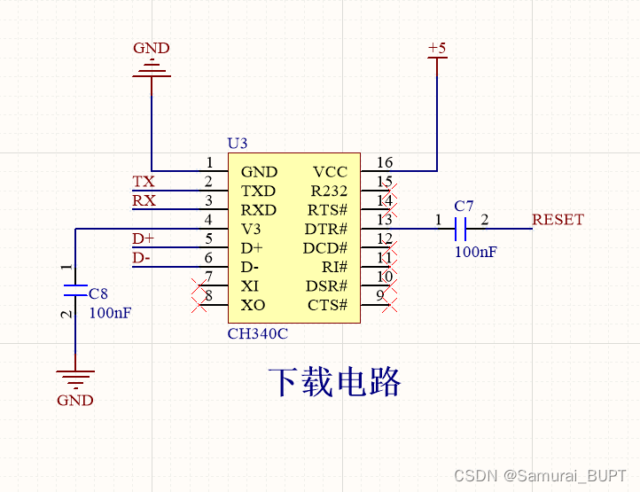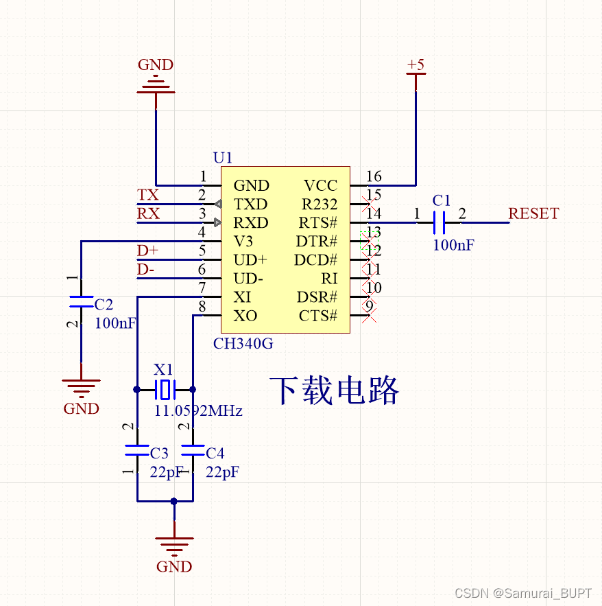这是CH340G的原理图。 (注意换接RTS#、外接晶振的区别。)