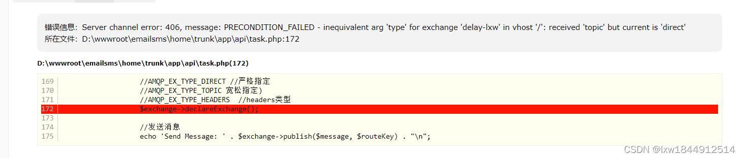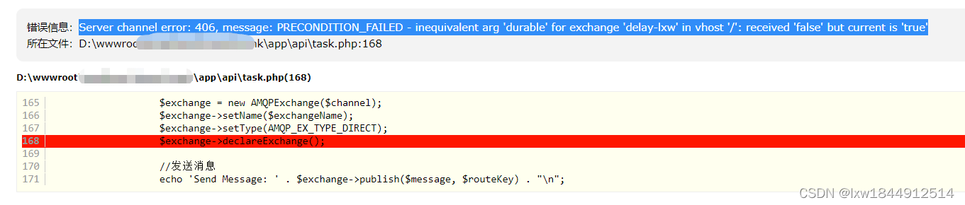 1.Server channel error: 406, message: PRECONDITION_FAILED - inequivalent arg 'durable' for exchange 'delay-lxw' in vhost '/': received 'false' but current is 'true'