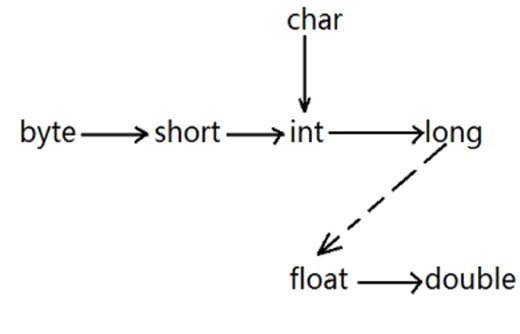 - 自动类型转换:是一种小类型到大类型的转换,不需要强制转换符。
