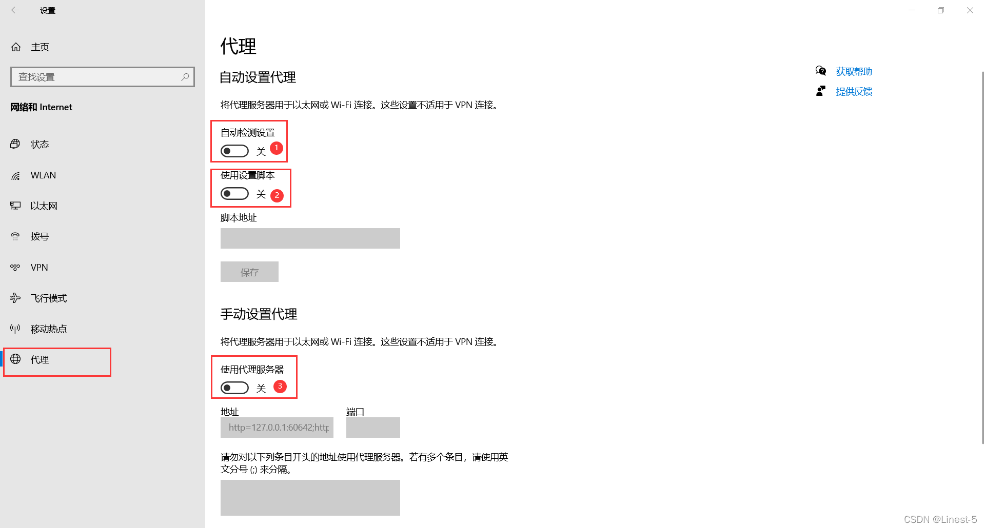 3、点击代理选项,分别关闭图片中的选项:自动检测设置、使用设置脚本、使用代理服务器。