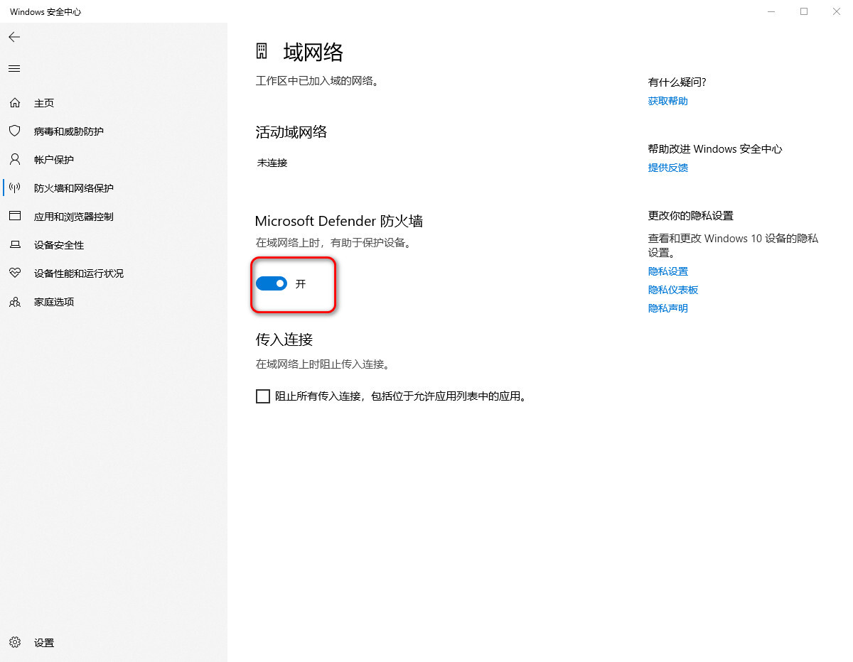 - 关闭防火墙后,左边菜单栏选择“病毒和威胁防护”;