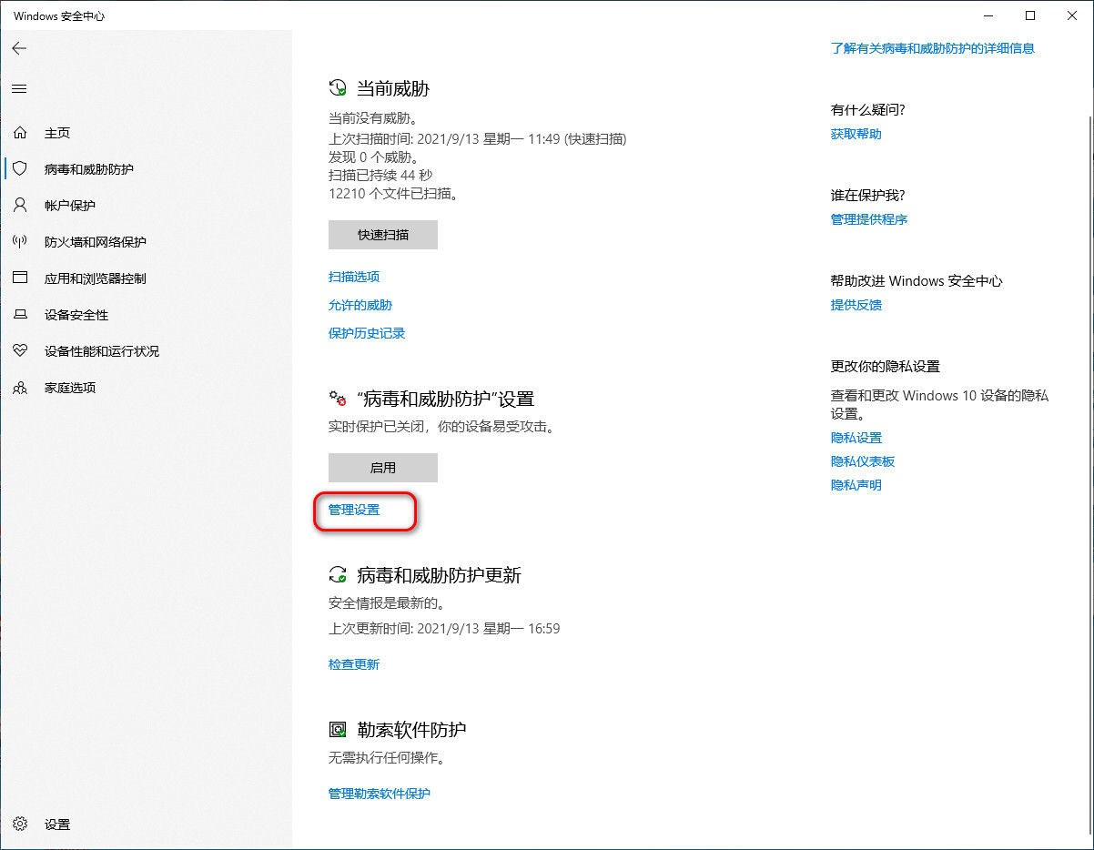 - 选择“病毒和威胁防护”下的“管理设置”;