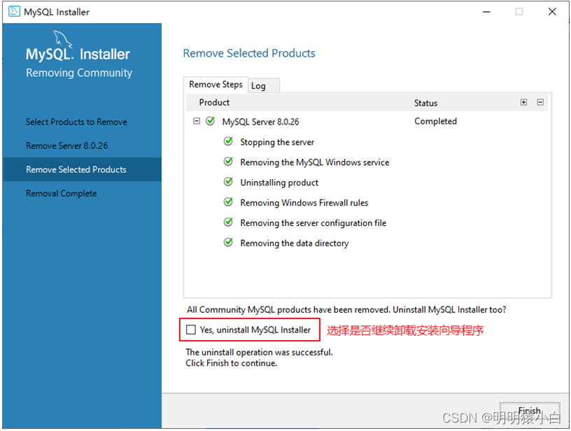6 卸载完成后,请单击“完整”按钮。如果您希望同时卸载 MySQL8,“是的,卸载 MySQL 安装器”与“是的,卸载 MySQL”安装程序运作良好,如图所示。