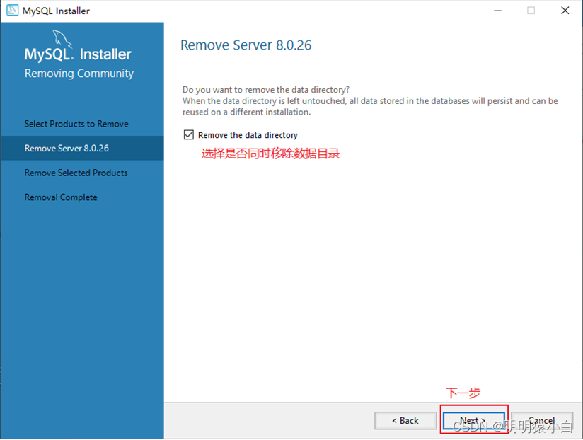 4 是否同时弹出数据目录选择窗口 。 如果您想要同时从 MySQL 服务器中删除数据, 是否同时退出 。 Tick “ 直接删除数据 ” 。