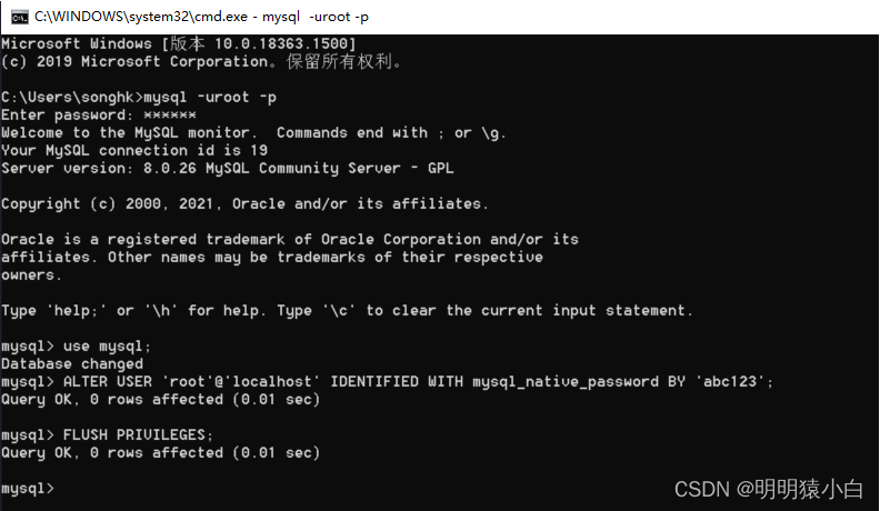第二种解决办法如下:在通过指挥线登录到 MySQL 数据库后,要更改密码加密规则并更新密码,请使用以下命令。用户密码规则“ root@ localhost” 已被改为“ Mysql_ native_ password ” 。密码是"123456"如图所示。
