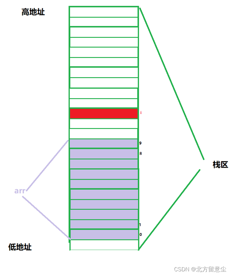 最初,Arr中只有10块,但我绕了12圈,在AR[10]时已经越过边界。首先,i和Arr是本地变量。先创建i,再创建arr,由于本地变量储存在储存区,这不可行。首先使用最高地址是习惯做法。再使用低地址