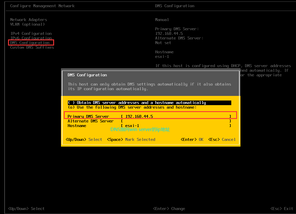 ESX 主机上的 DNS 必须提及 Win 服务器的静态 IPv4 地址 。