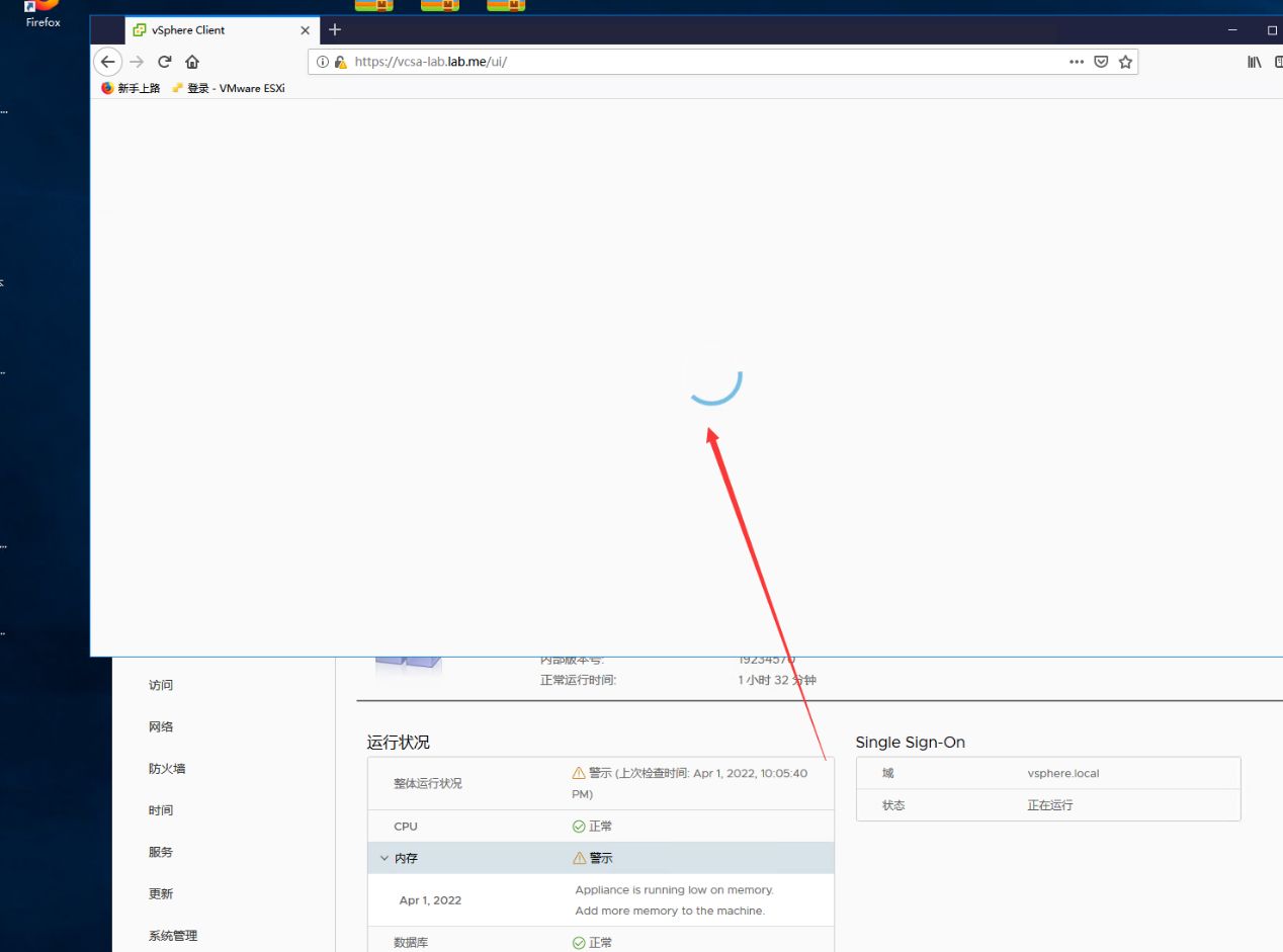 在VSphere安装的第二阶段完成后, vCenter 管理页面的5 480页开放供正常访问;然而, vSphere 客户端的443页仍然在圈子里,无法进入。