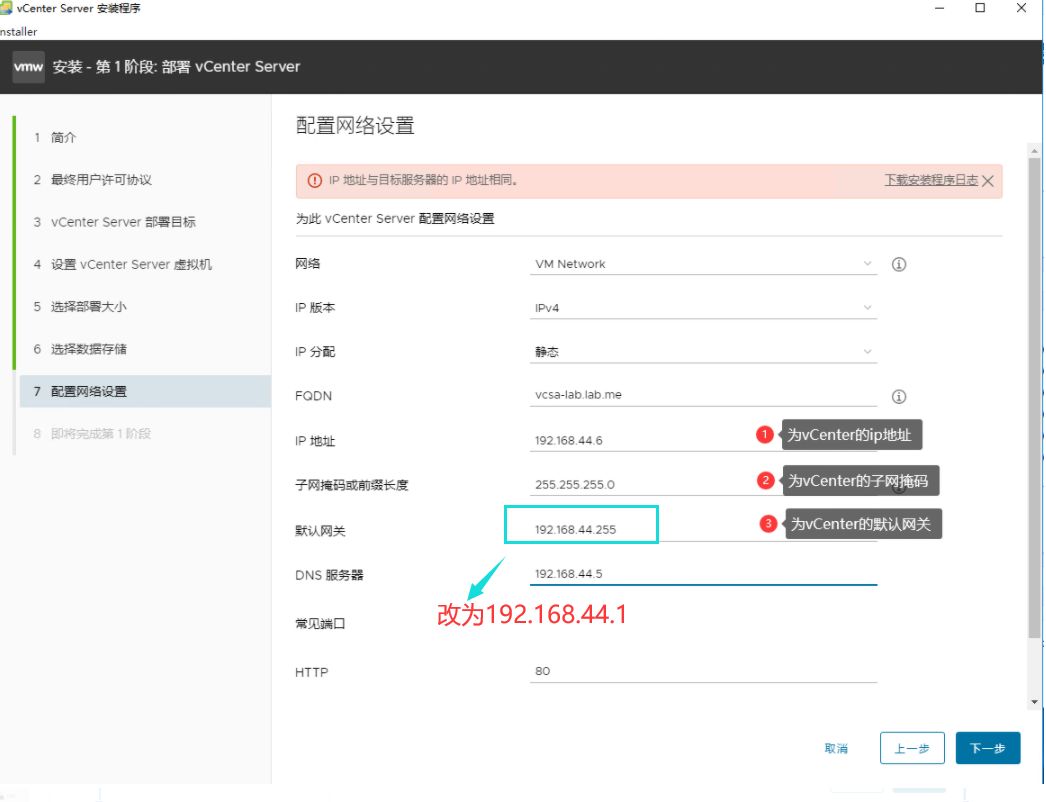 更改阶段 1 : 在部署 vCenter 服务器时, 第 6 步在网络设置中设置默认网关( 在下面. One is the key), 然后进行进程 。