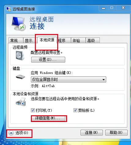 在远程桌面连接选项中选择本地资源, 然后单击详细配置, 然后单击本地磁盘, 当您连接到服务器时, 您可以在我的机器中看到本地磁盘, 这样您就可以复制大文件 。