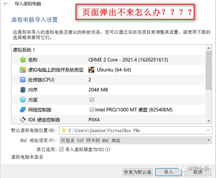ovf 后,双击 QIIME 2 Core- X.Y.E.L.D.Z (Creat_numbert.ov) 不能出来设置接口 。你不可能在这时候被困住!如果这是你第一次将QIIME 2 导入虚拟计算机,你就得这么做。点击导入,一步一步来! 一步一步来!也可以新建导入哦~
