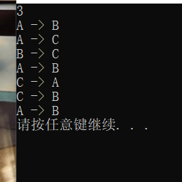 执行程序,输入3, 这表明我们正在移动 三层Hannota, 我们会得到三层Hannota的移动顺序。