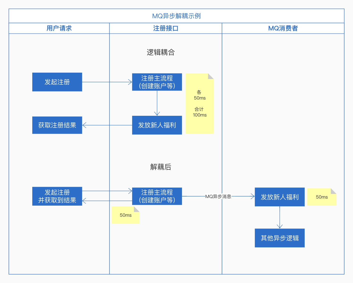 就用户登记接口而言,假设有2个业务点,他们已注册入学,领取新的津贴,领取新的津贴,领取新的津贴,并领取新的津贴。我们每个人都需要50毫秒来处理逻辑。如果我们使用单一接口连接这两个业务流程,因此,处理需要100毫秒。但是该流程中,用户注册时候,如果你不关心,你就得支付 如果你不支付自己的福利 立即。一旦您注册成功的数据返回,您就可以检索到您的数据 。新来者额外好处的这一部分可以与主要程序分开处理。如果我们除掉它主要接口程序只是负责着陆逻辑。它和现在不一样, 它和现在不一样, 它和现在不一样, 它和现在不一样, 它和现在不一样, 它和现在不一样, 它和现在不一样, 它和现在不一样, 它和现在不一样, 它和现在不一样, 它和现在不一样, 它和现在不一样, 它和现在不一样, 它和现在不一样, 它和现在不一样, 它和现在不一样, 它不一样, 它和现在不一样, 它和现在不一样, 它是以下步骤是处理分阶段向进入者提供奖励的理由。这确保了大约50毫秒的已登记接口可以取得结果。以及授予移民优势的行业。这项工作是通过不对称任务逐步完成的。 通过拆分业务点,我们已经做到解耦,在登记的附属活动中增加或减少职能点对主要进程没有影响。此外,如果在某一时刻要求并发布企业主程序,正好通过异步方式,它有能力在较长的时间内分散压力。目标是在一定的时间里减轻压力。这就是流量削峰。