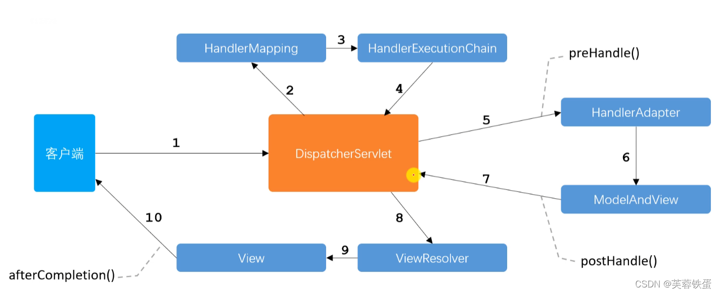 HandlerAdapter返回ModelAndView到 dispatcherServlet,在调用后返回postHandle()方法。