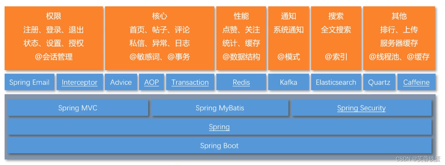 基于SpringMvc实现主页 、 邮件 、 注释 、 私人消息功能,例外和期刊使用通用技术。关注如何实现敏感词(前缀树算法),企业也需要关注(什么是企业,什么是事物的分离程度,如何管理业务。整个模块也使用咨询(控制器通知,统一处理异常), AOP(统一记录日志,事实上,许多其他功能(如交易)都应用于AOP、交易等。