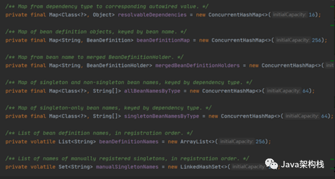 让我们再看看DefaultListableBeanFactory中的核心集,这些集主要存储Bean的描述信息(BeanDefinition)。