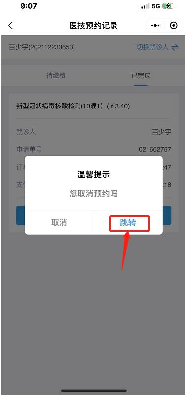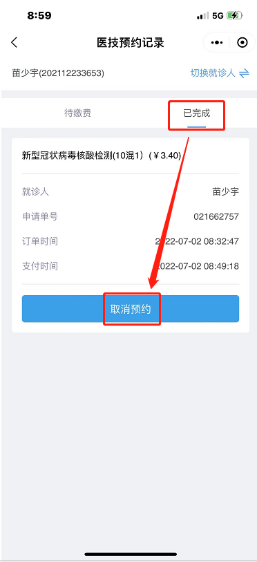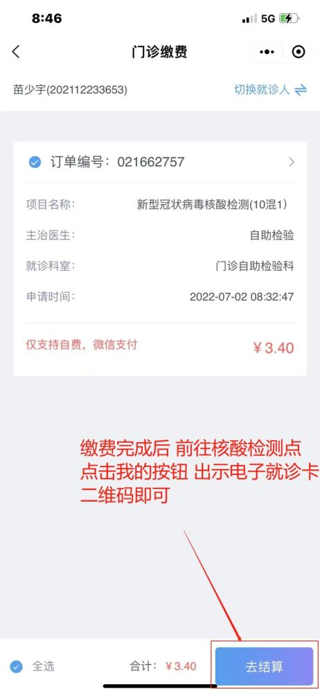3.付款完成后,前往核酸检测点,点击我的按钮,显示电子预约卡。