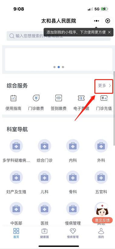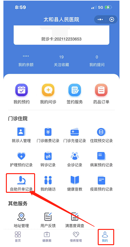 点击我的按钮,在综合服务栏中找到更多按钮,点击诊所费用,并遵照指示