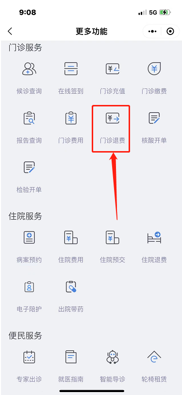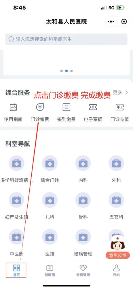 1.单击主页按钮,滑下手指,找到综合服务栏,然后单击诊所付款按钮。