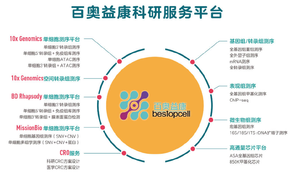百奥益康科研服务以单细胞服务为主体,配以其他以高通量测序和芯片为基础的多组学服务,提供一站式的科研服务,从而实现从单细胞水平到bulk水平系统完整的解决方案。