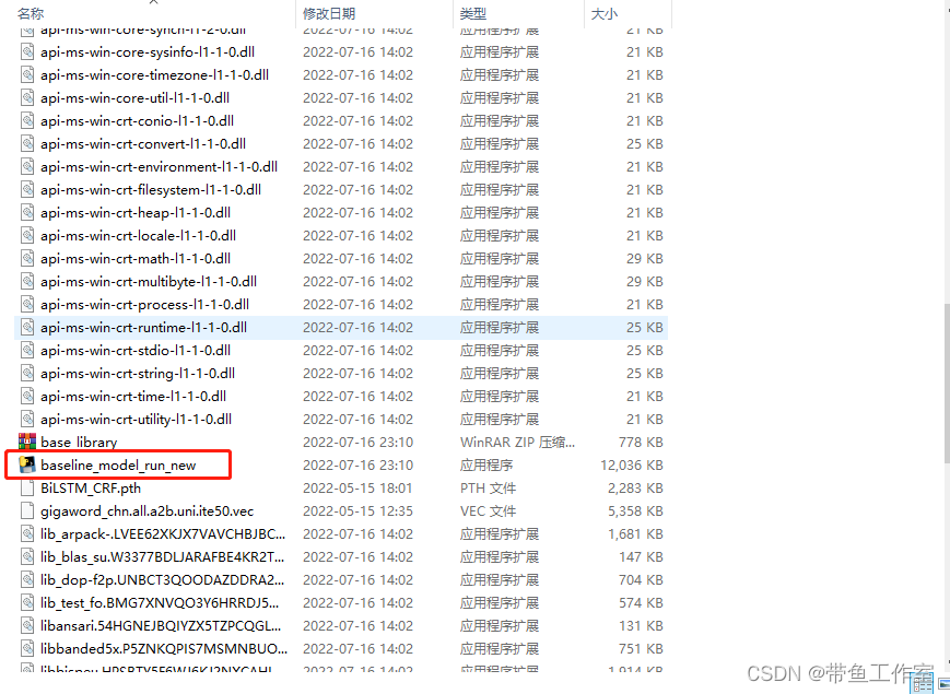 图1是我包装的例子,我的文件夹包含basicline_model_run_new文件夹,因为我的包名是basicline_model_run_new.py,指定的文件夹名与您包装的程序的名字相匹配),打开baseline_model_run_new文件夹即为图1所示,由图1可知,它包含红色的执行文件和更多的依赖文件,这种才是正确的,如果您只有在文件夹中的一个exe文件,所以有人不能运行你的 exe文件,因为没有打包环境,请遵照第1.1和1.2段重新操作。