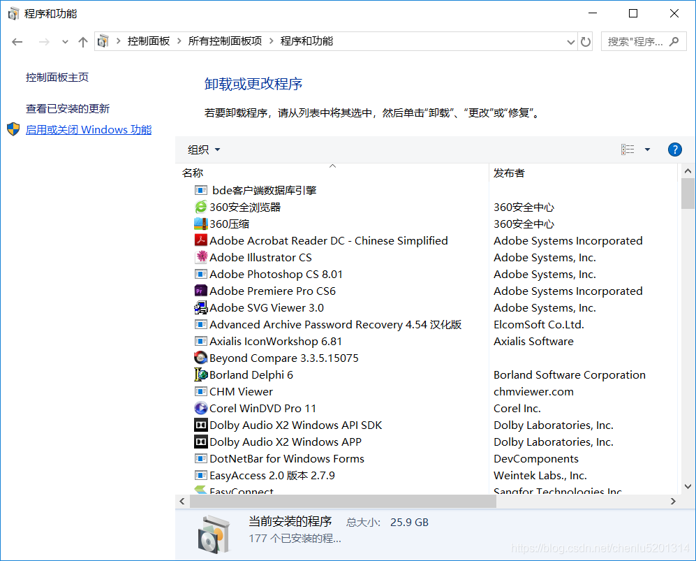 - [ 程序 和 功能 ] 接口 点击 "启用或禁用Windows功能”;