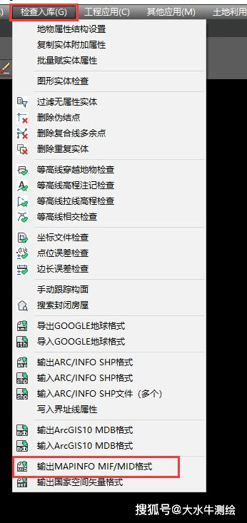 CASS 10.1检查库模块具有输出MAPINFOMIF/MID数据格式的功能,可以输出CASS数据MAPGIS格式数据,如下图所示: