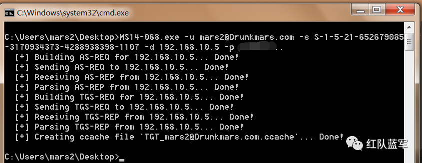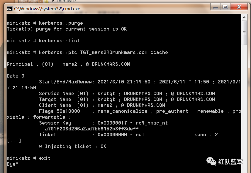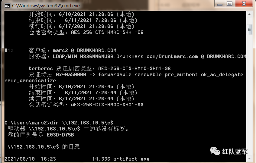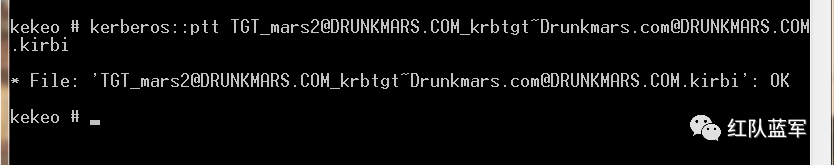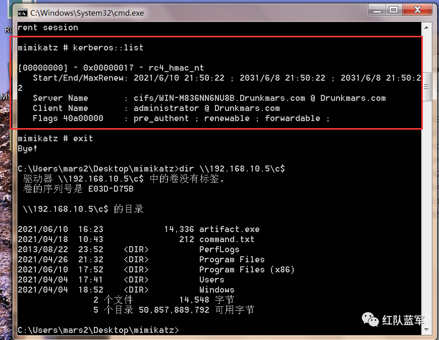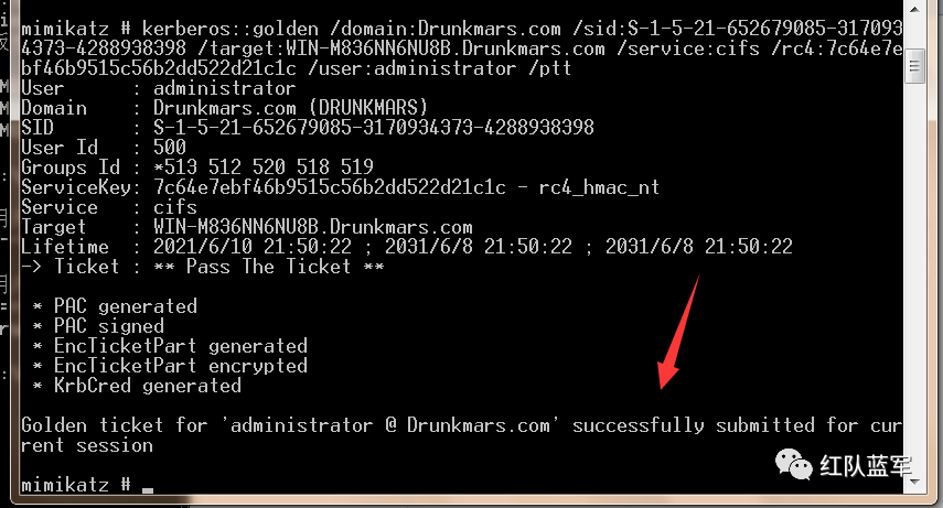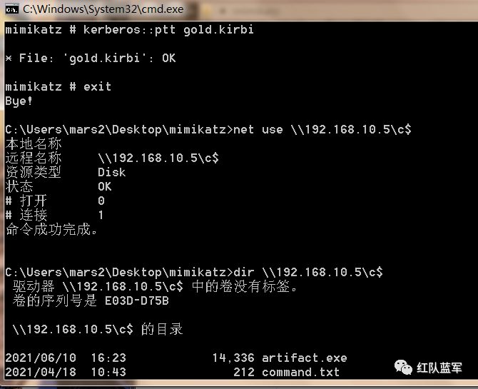 使用mimikatz将收据插入当前的内存,并伪造证书。如果成功,拥有域名管理权限,可以随意访问所有域名中的机器