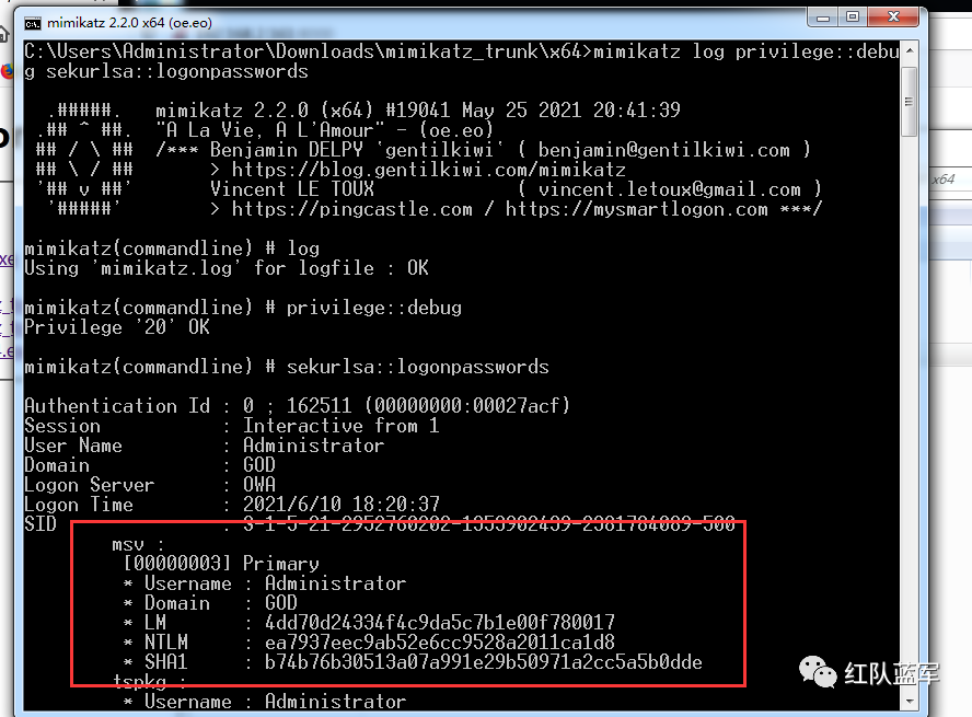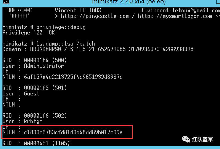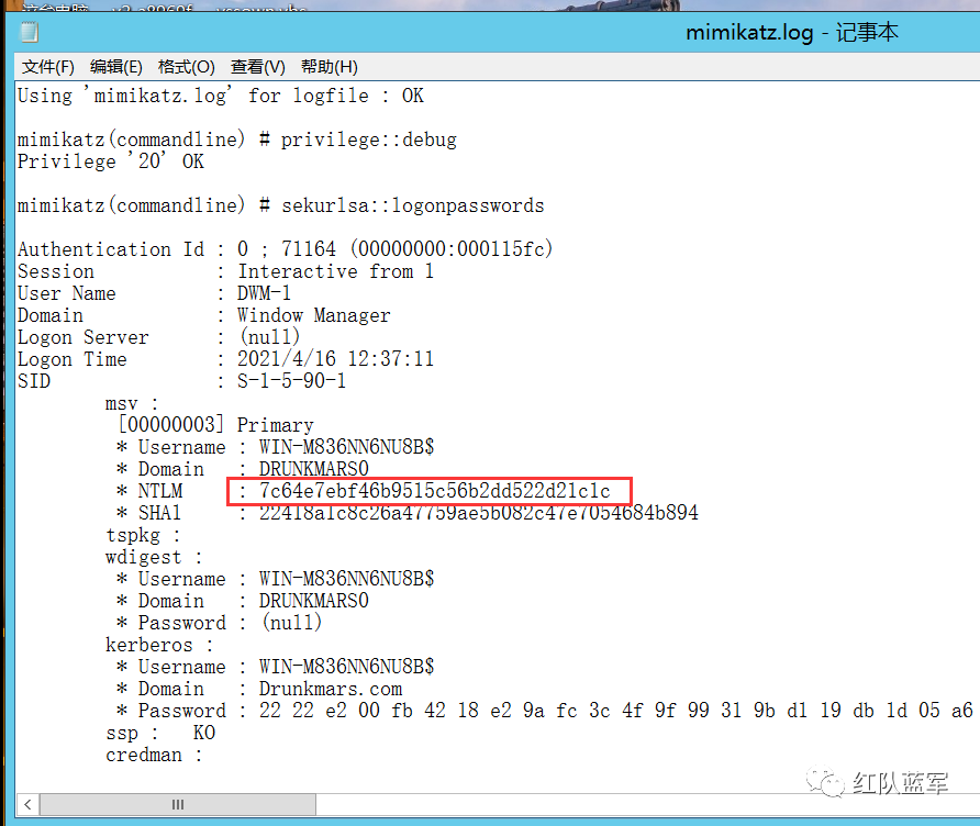 首先使用mimikatz抓住域名 pipehash,小心mimikatz在捕获哈希之后直接复制是不可能的,所以我们选择使用日志参数来获取捕获的哈希输出为txt