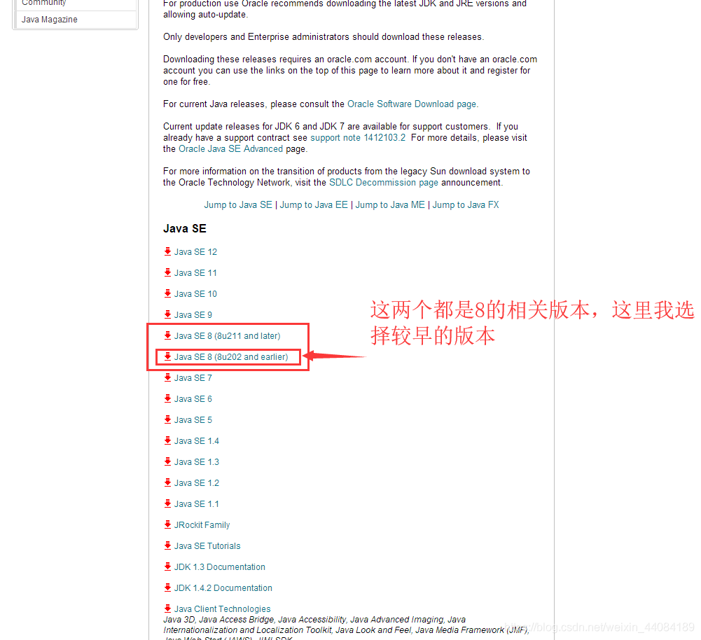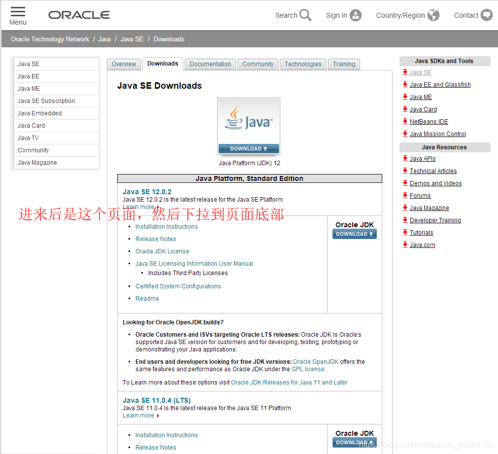 5.在此处进入JDK下载页面,然而,这里是JDK的最新版本(目前更新为JDK12),但是一般来说,开发人员会选择以前的版本,更稳定。选择可以根据个人需要进行,如果你想下载其他版本的JDK,将页面下拉到底部。