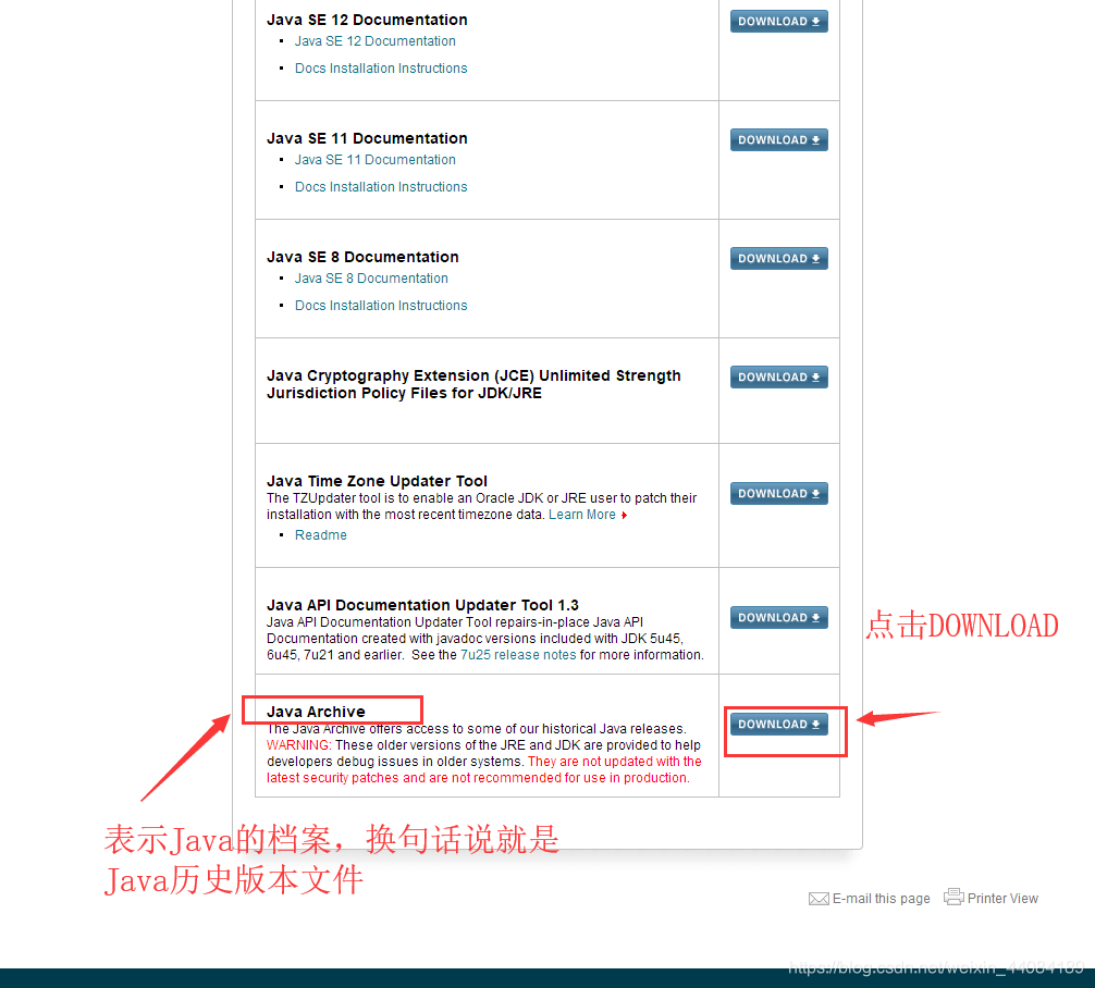 6.找到Java Archive(Java的档案),即Java之前其他的历史版本文件。点击DOWNLOAD。