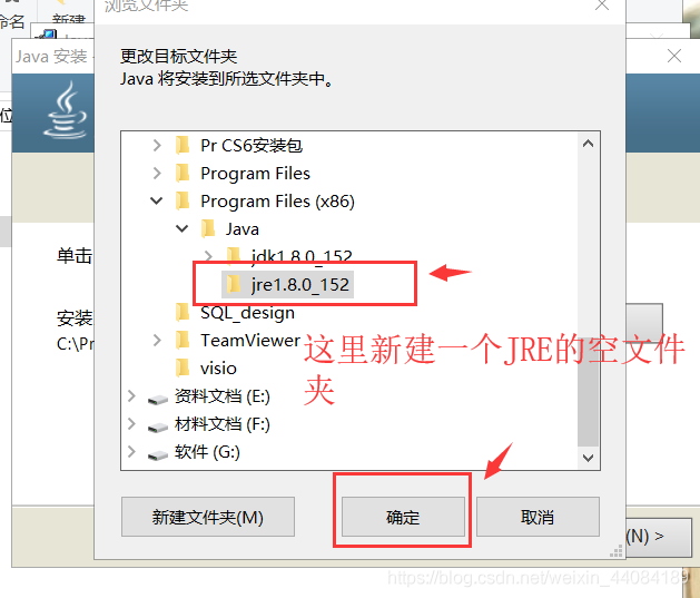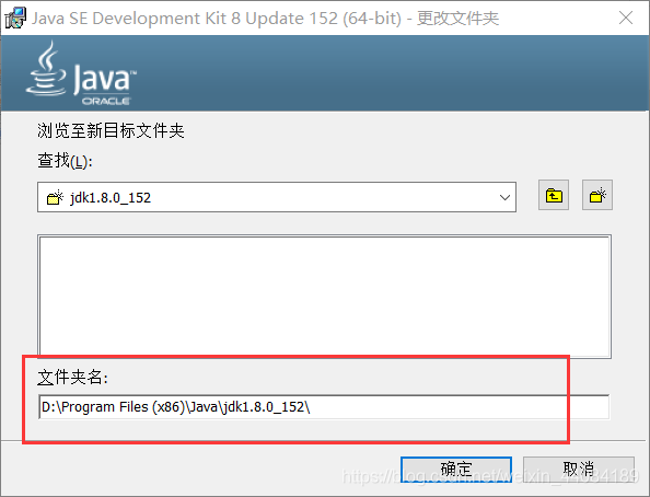 就像JDK安装目录一样,我在空文件夹的Java文件夹.8.0_152下创建了新的"jre1",选择这个文件夹,然后单击OK。